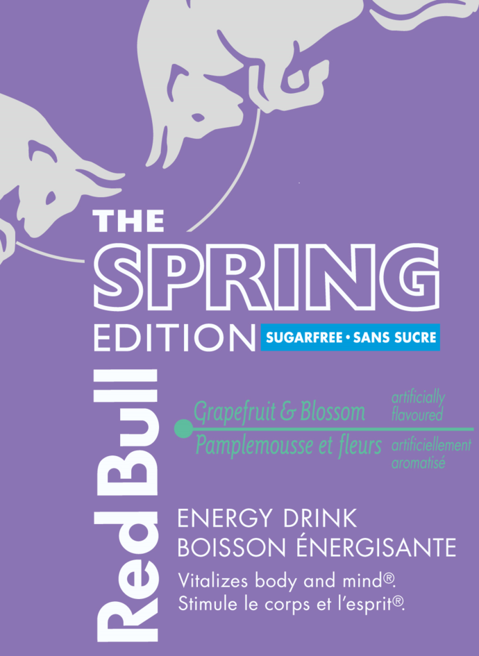 REDBULL THE LILAC EDITION SUGARFREE SANS SUCRE GRAPEFRUIT AND BLOSSOM PAMPLEMOUSSE ET FLEURS ARTIFICIALLY FLAVOURED ARTIFICIELLEMENT AROMATISÉ ENERGY DRINK BOISSON ÉNERGISANTE VITALIZES BODY AND MIND STIMULE LE CORPS ET L'ESPRIT